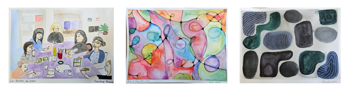 De gauche à droite: “Les femmes qui créent” par Valentina; “Being at peace / Être en paix” par Aliza; et “Sans titre” par Alexandra.