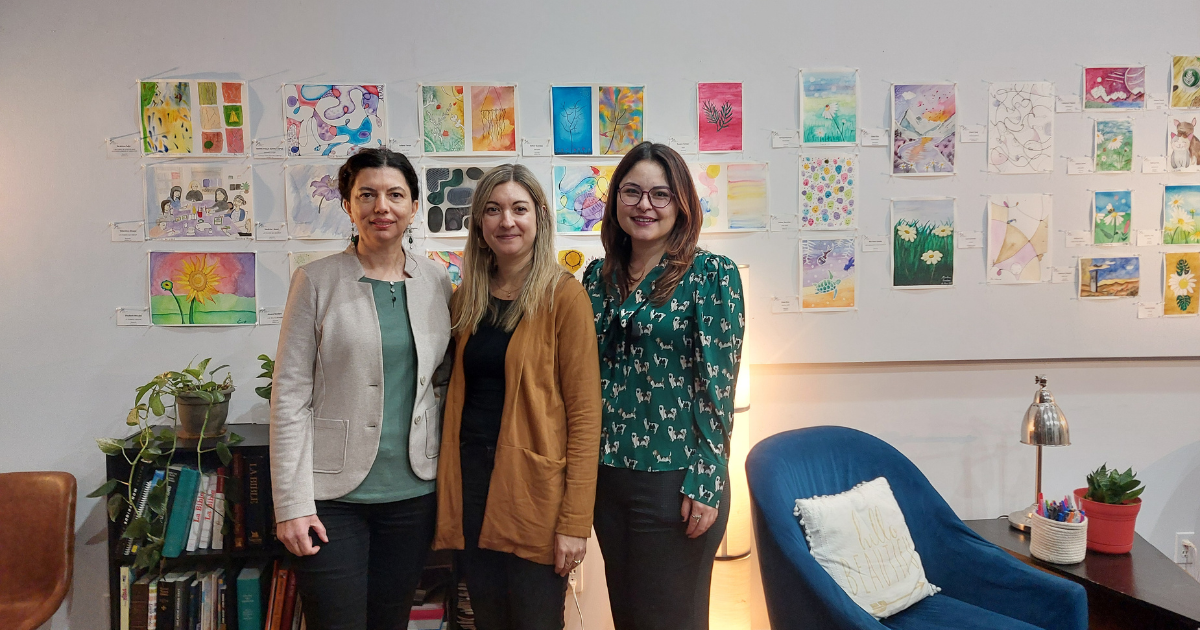 Les 3 artistes dont les oeuvres ont remporté le prix du public. De gauche à droite: Valentina, Aliza et Alexandra, en compagnie de Carmen Albu, responsable des ateliers d’aquarelle pour la gestion du stress au CJE de Verdun.